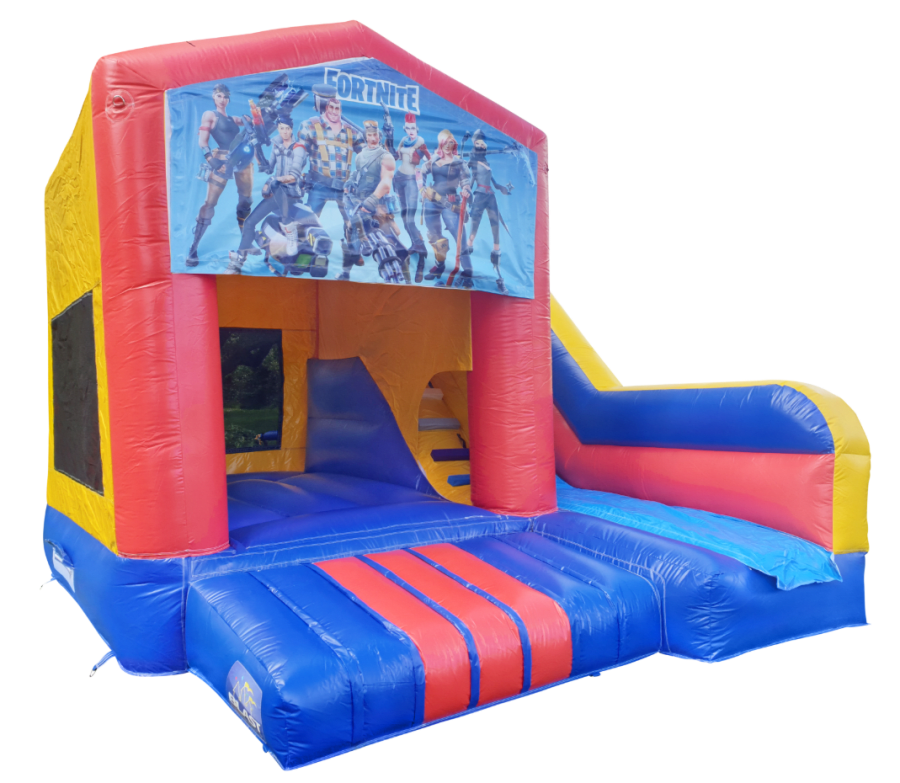 This Fortnite themed bouncy castle is 4m x 5m and is perfect for Fortnite birthday parties, The inflatable has a rain cover built in which will help with rainy days.